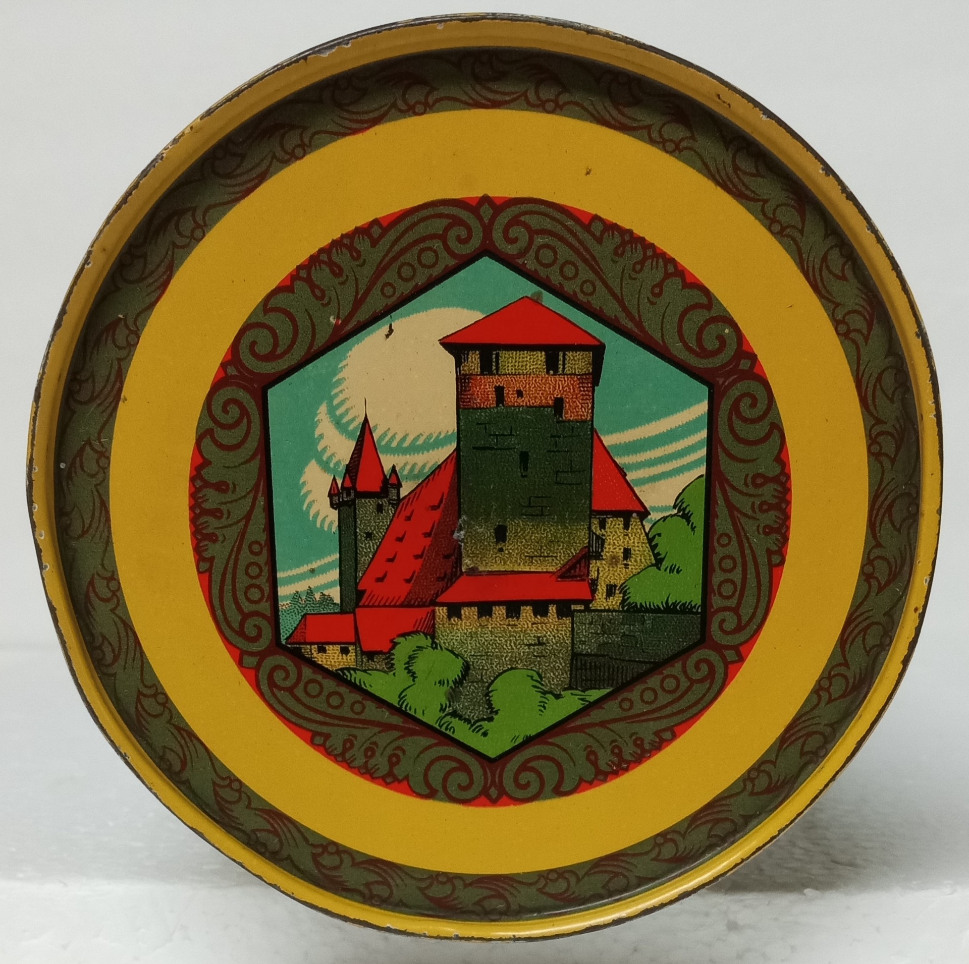This is a very small tin of 2.75" round x 2.75" tall. I got it off of German eBay, 2025, & the only reason I paid 15€+6€ = $23.02 with additional S&H to the U.S., is the goal to have at least one tin from each company I've discovered. (TTM #4431) Click to zoom tins below.