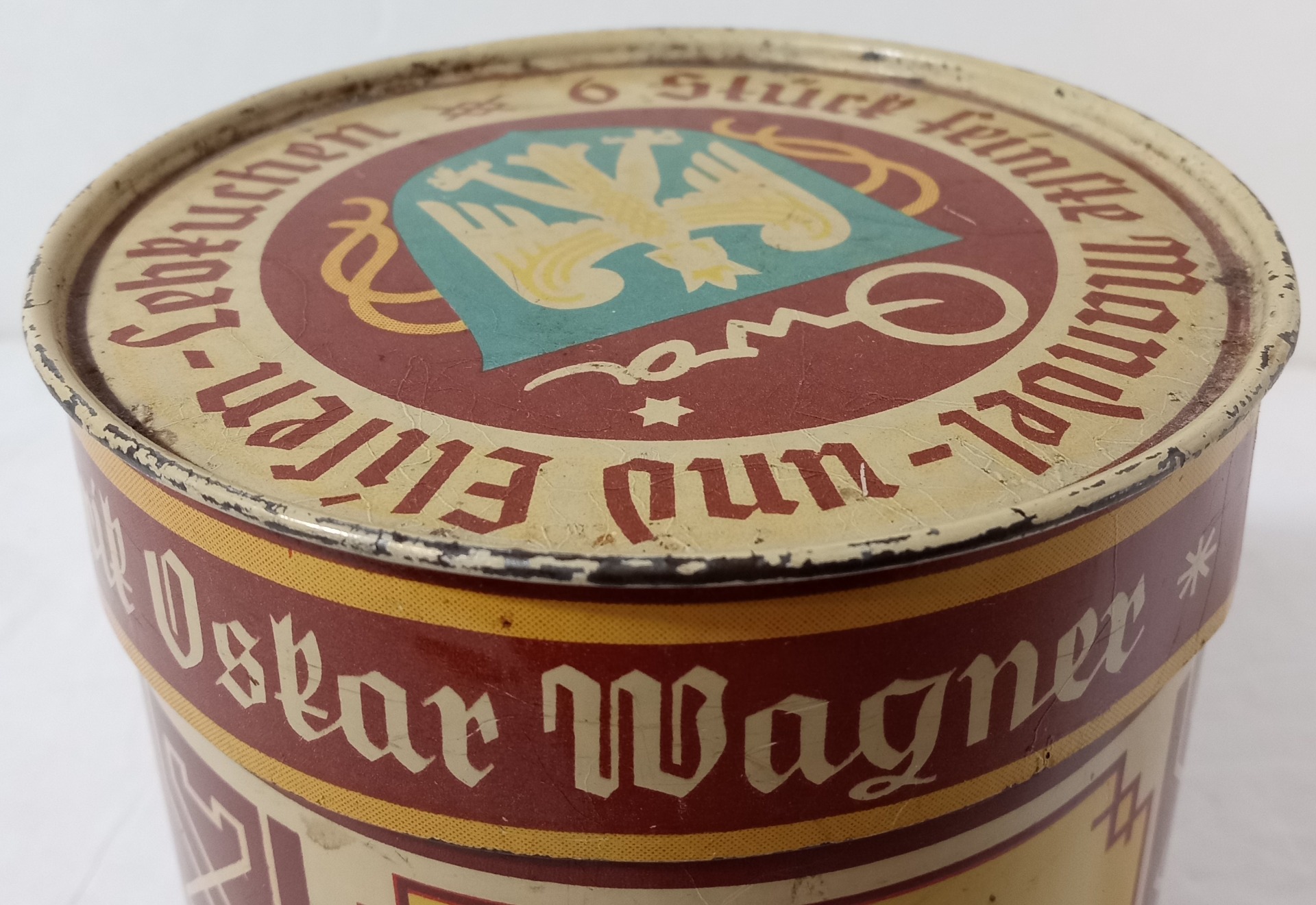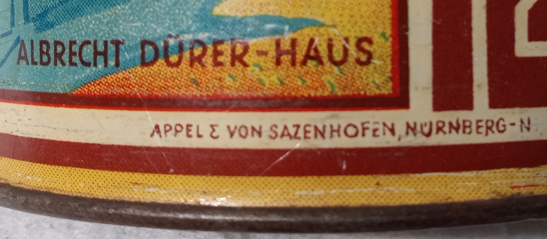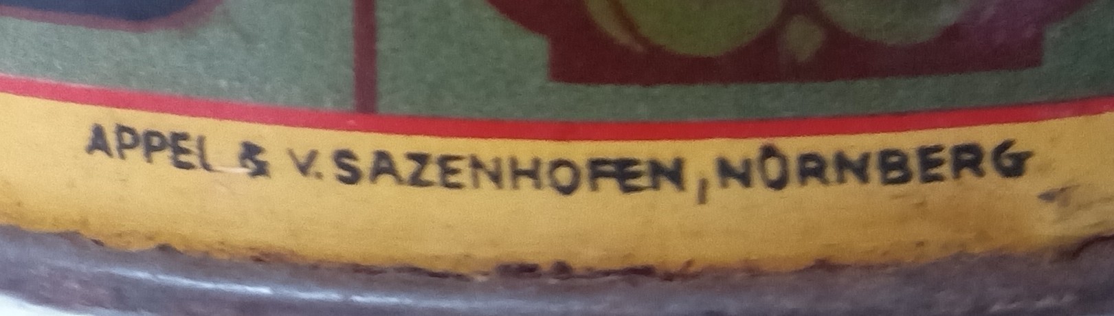 What the association was among these 3, I don't know! The tin on the left has an "Owa" on it. The photo on the top right has Oskar Wagner's name on it. (There's no Aug. Hausler name on this tin.) But on the bottom right photo, the "APPEL & VON SAZENHOFEN" name is on this tin! Who these 3 were, as Lebkuchen companies, a designer/tin manufacturer, or through time one bought out the other, etc., I don't know. It will be interesting if I get the history info some day.