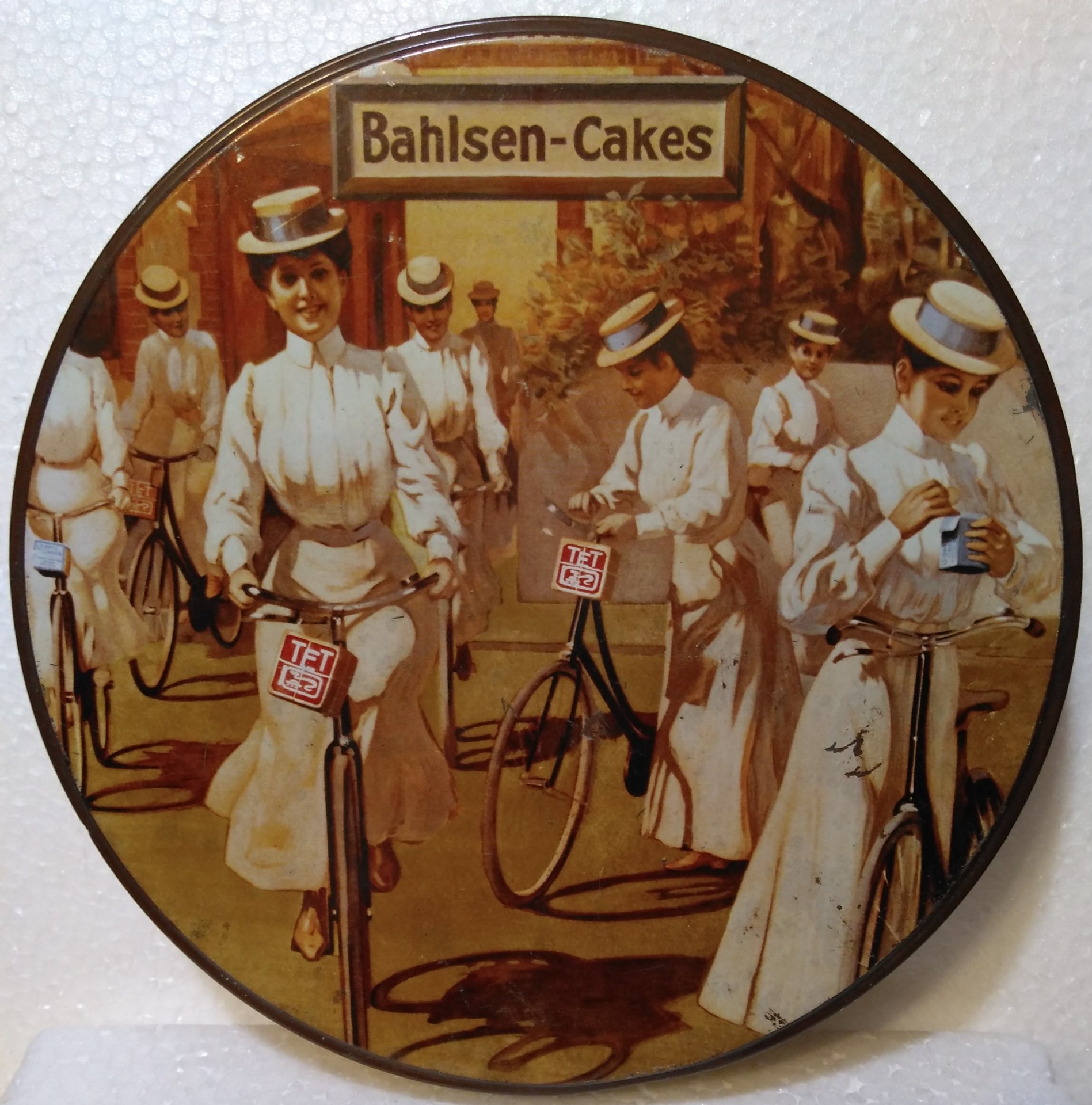 The ladies on bicycles look like they're in the 1920s-'30s style of dress -- very demure, legs covered to the ankles, & straw hats. This tin says "cakes," so maybe small pastry-type petit fours??? - But read on . . .